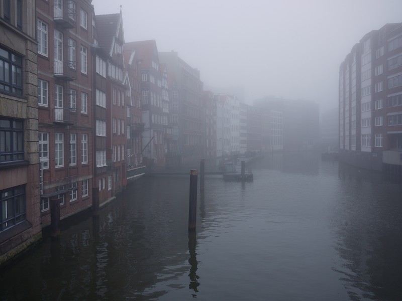 Es ist der Teil Hamburgs zwischen Alster und Norderelbe, der mit Wasseradern durchzogen ist. Seine unzähligen Brücken zeichnen sich unscharf ab. Horizontale Elemente im vertikalen Kosmos. Verbleibende Strukturen in diesem alles auflösenden Grau. Nebel über den Fleeten.